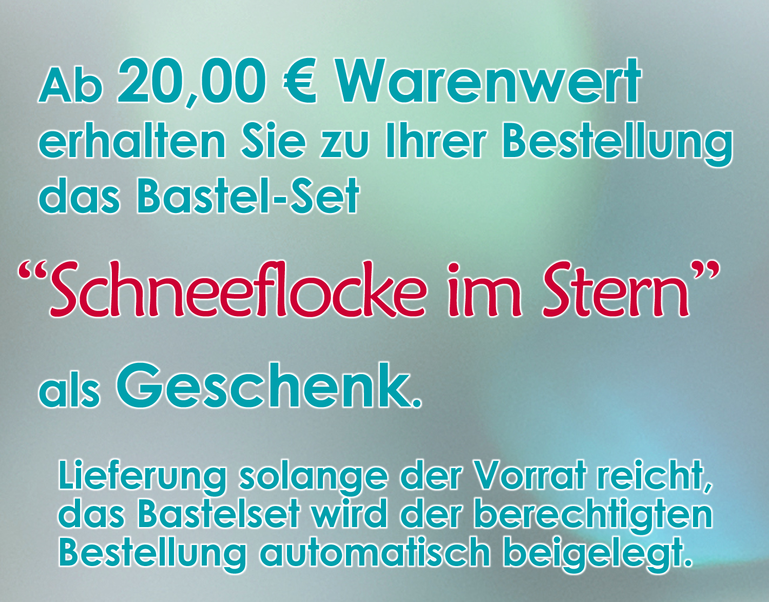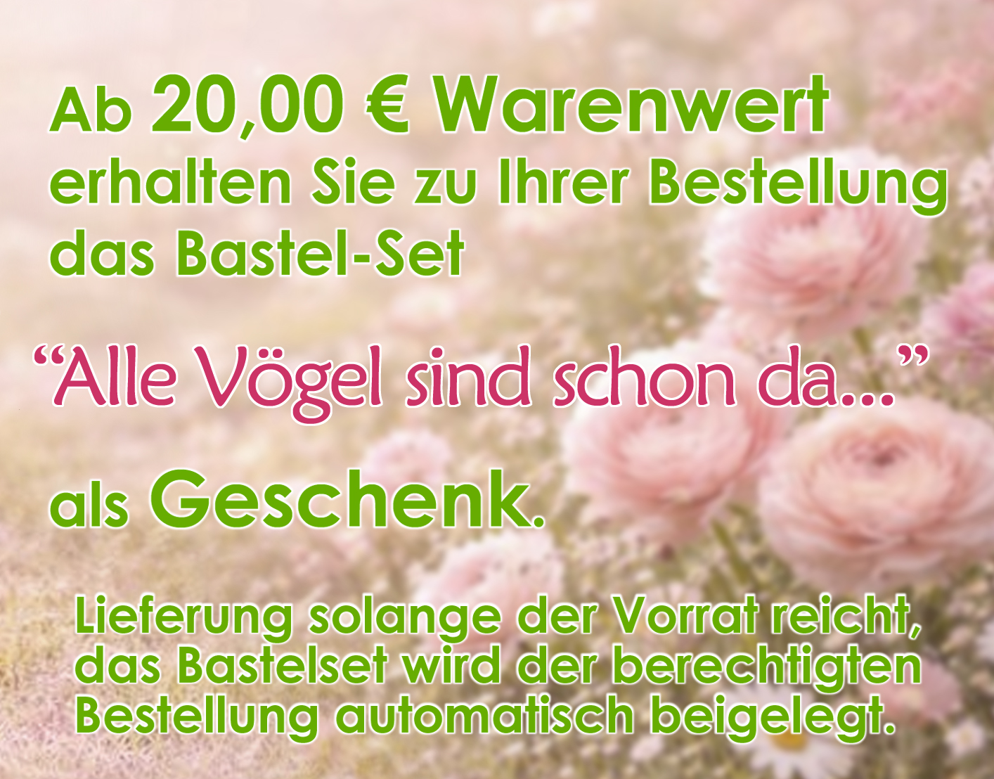 Lieferung solange der Vorrat reicht, das Bastelset wird der berechtigten Bestellung ab 20,00 € Warenwert (ohne Versandkosten) automatisch beigelegt.