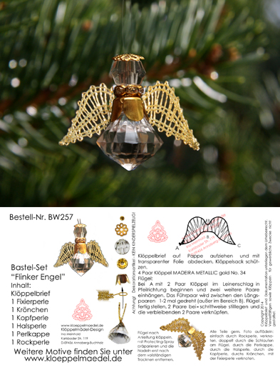 Durch die verwendeten Acryl-Perlen ist der Engel leichter als mit Glasperlen und somit auch für dünnere Zweige geeignet. Der einfache Klöppelbrief ist schnell gearbeitet und somit flink ein kleines Geschenk fertig gestellt.