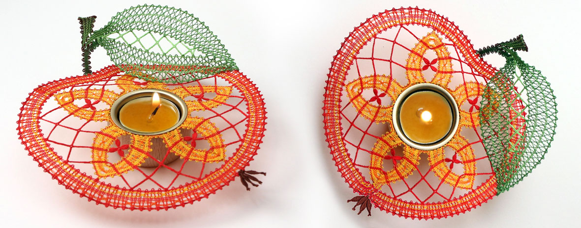 407 Klöppelbrief „Apfel" für Holz-Teelichthalter